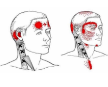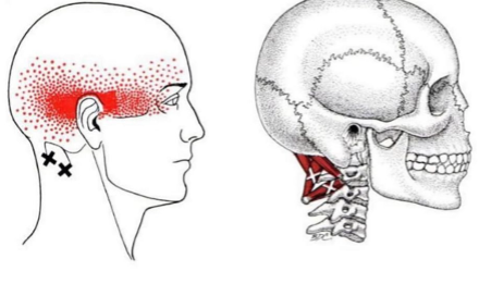 - Triggerpoints en uitstraling: De spierknopen veroorzaken hoofdpijn die vaak aanvoelt als een strakke band om het hoofd.